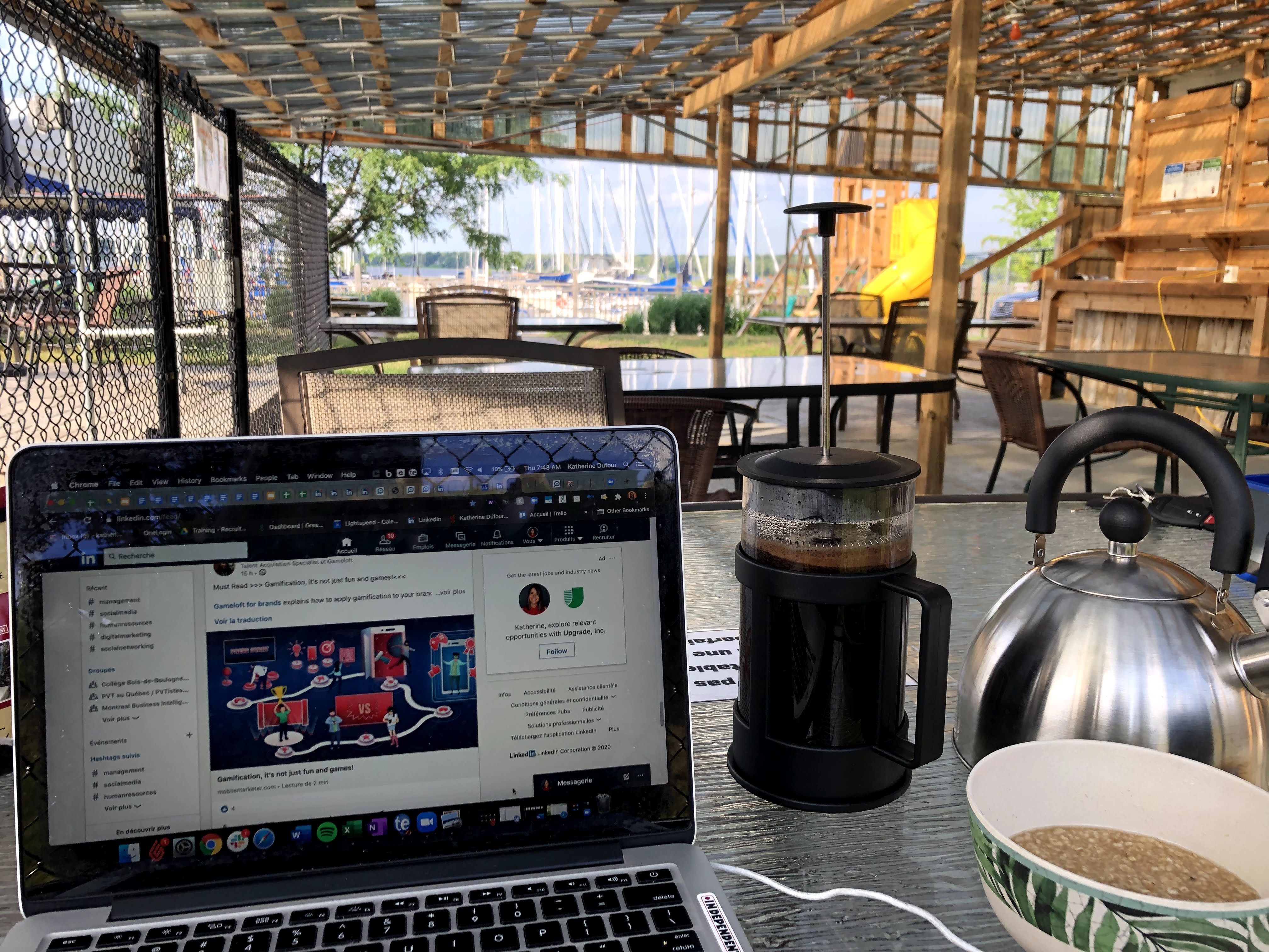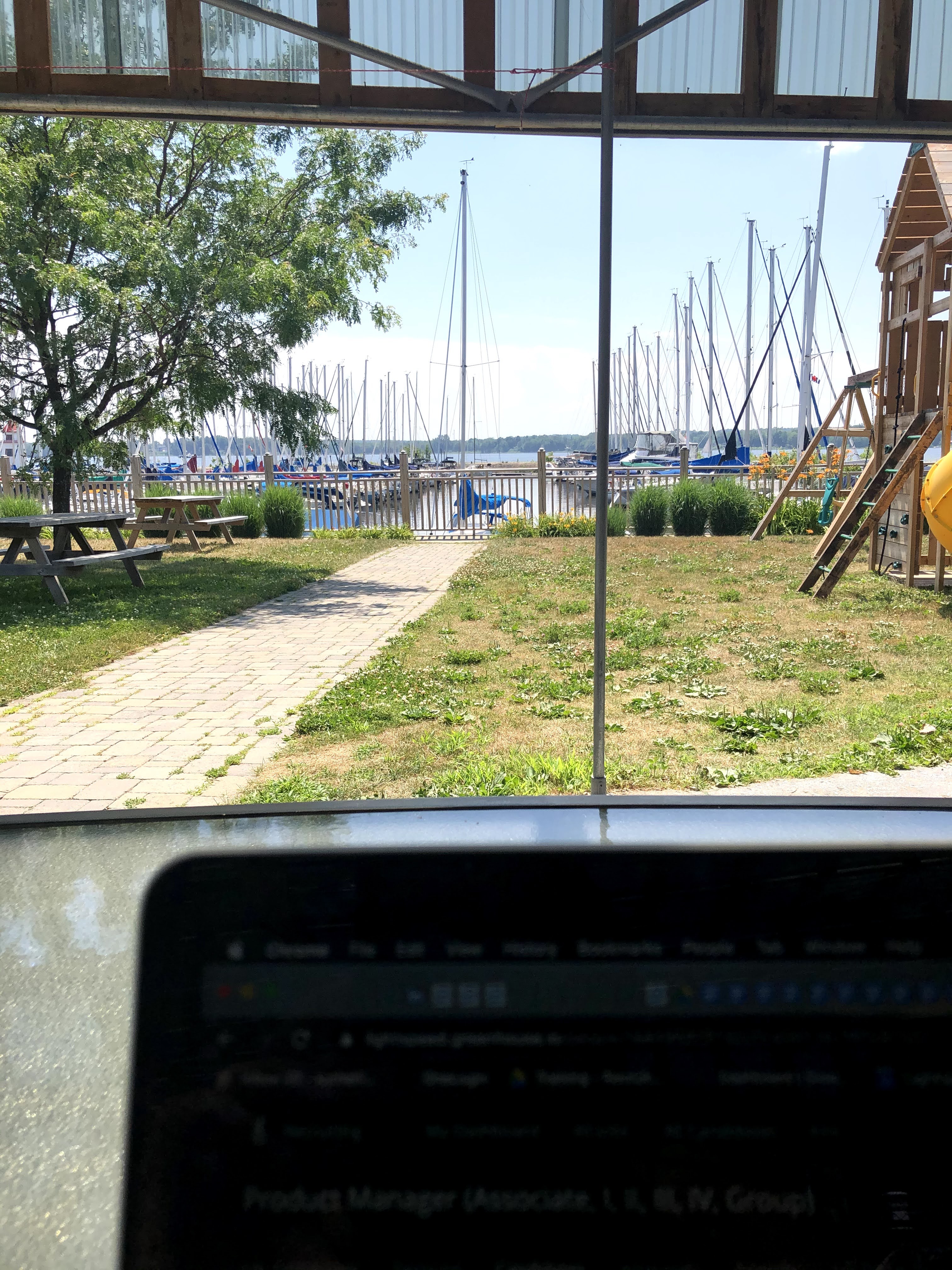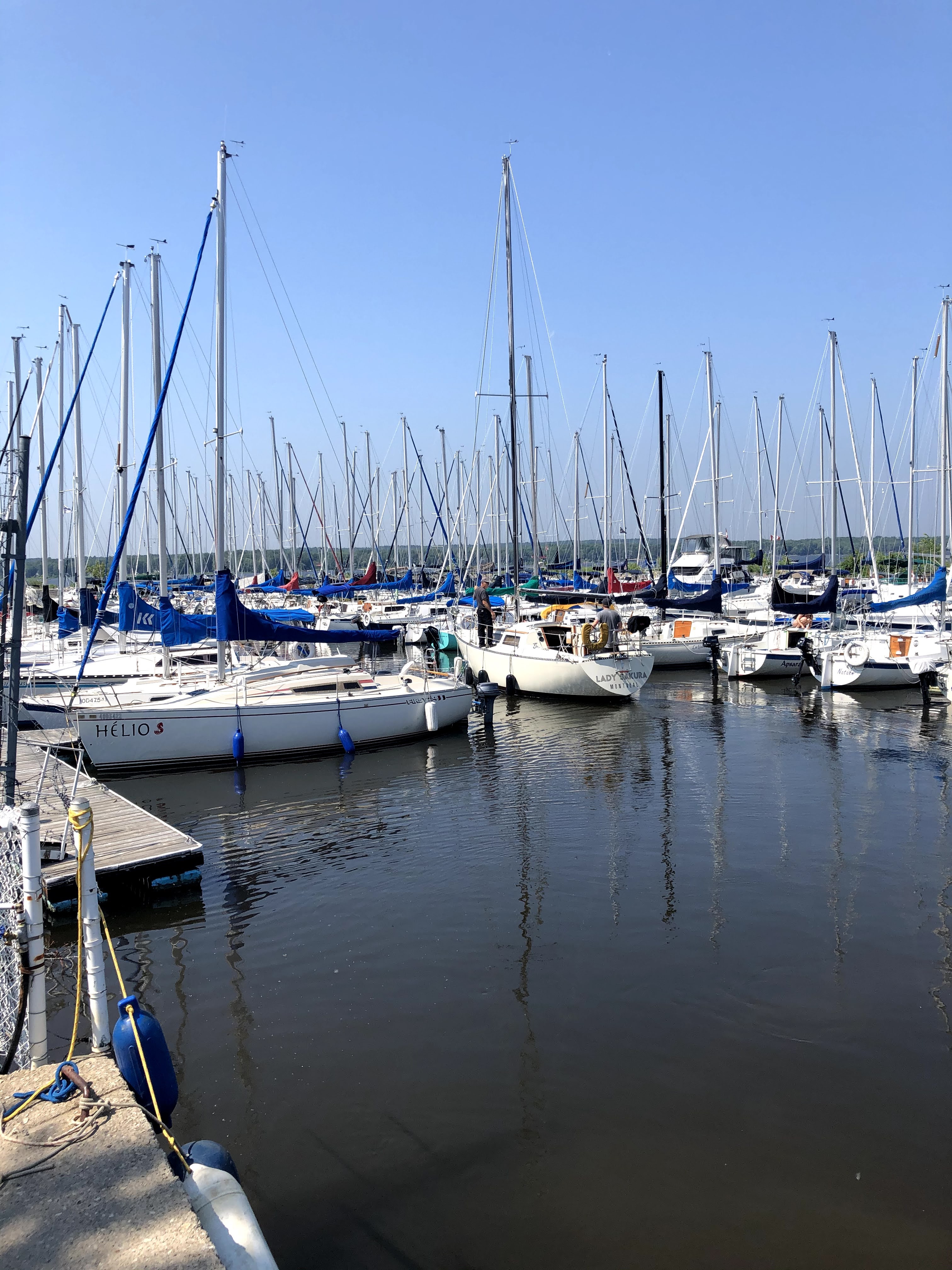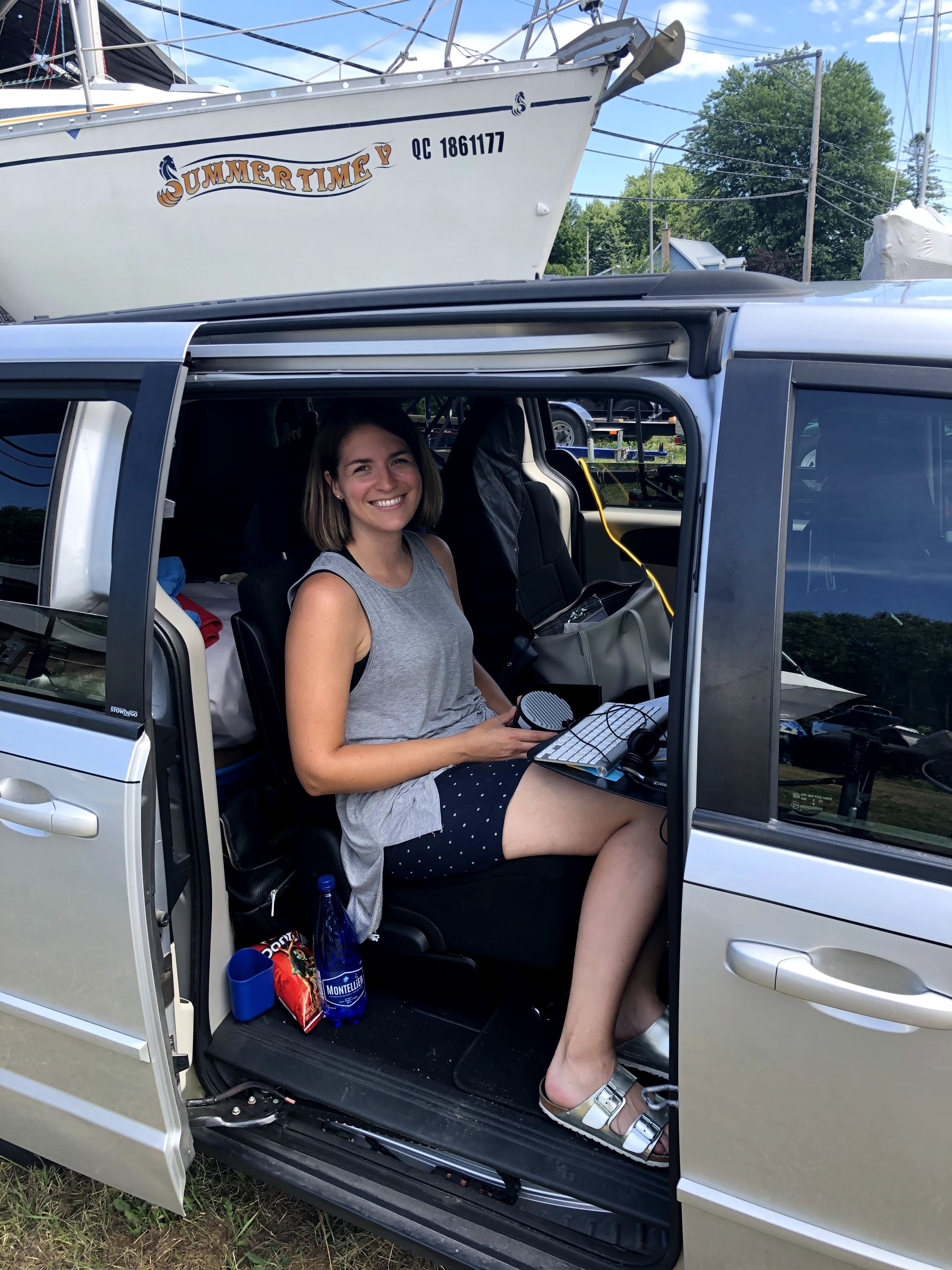 On a vécu pas mal à l’étroit durant cette première semaine. Mais tout s’est bien passé. Mieux même que je l’aurais espéré. Le Wifi de la marina fonctionne très bien et notre minivan m’a été très utile pour mes appels plus confidentiels. Le fait de ne plus être enfermé dans mon bureau à VMR, être à l’extérieur, cotoyer d’autres personnes et changer mes endroits de travail ont été très bénéfique pour moi.