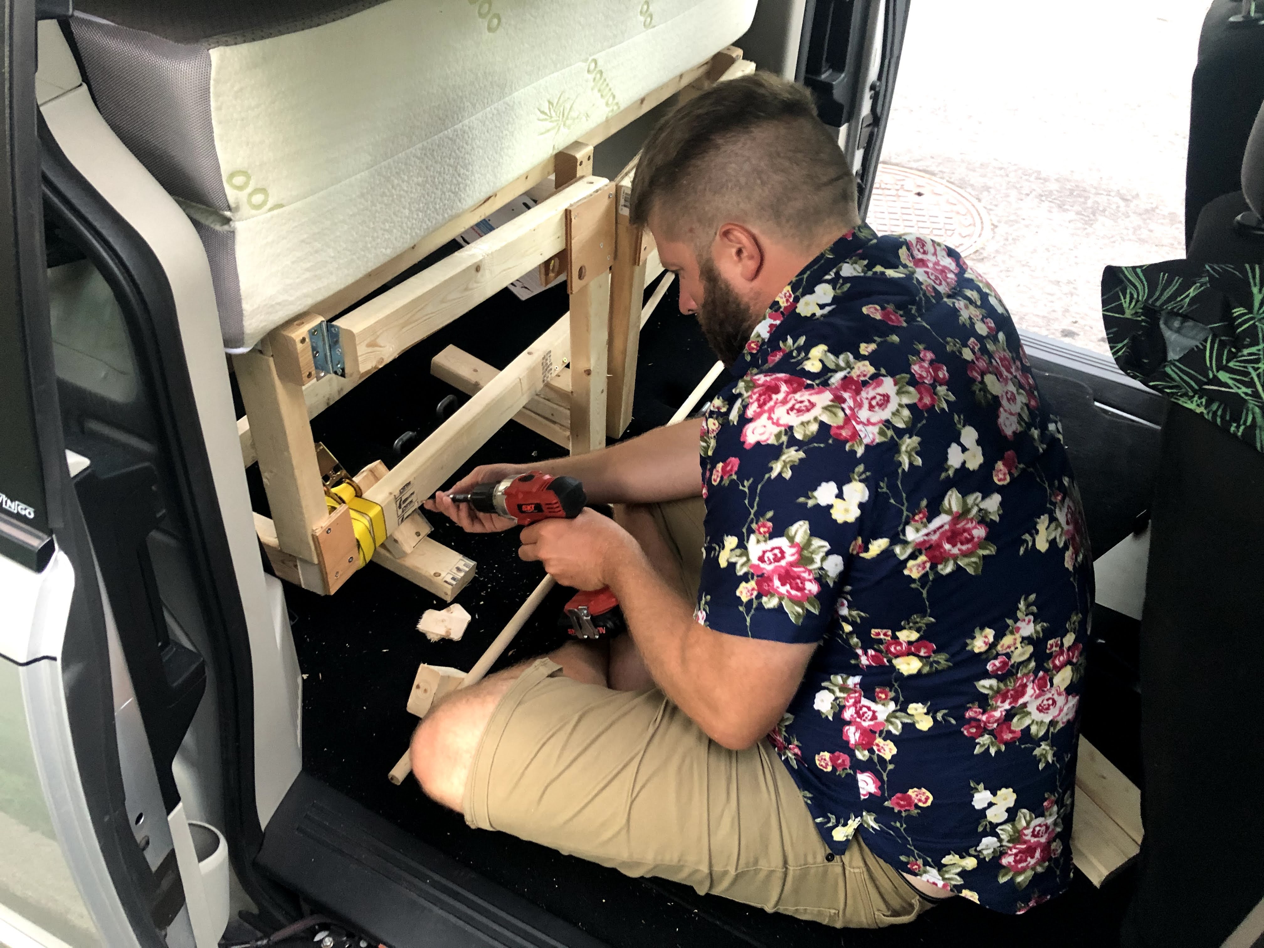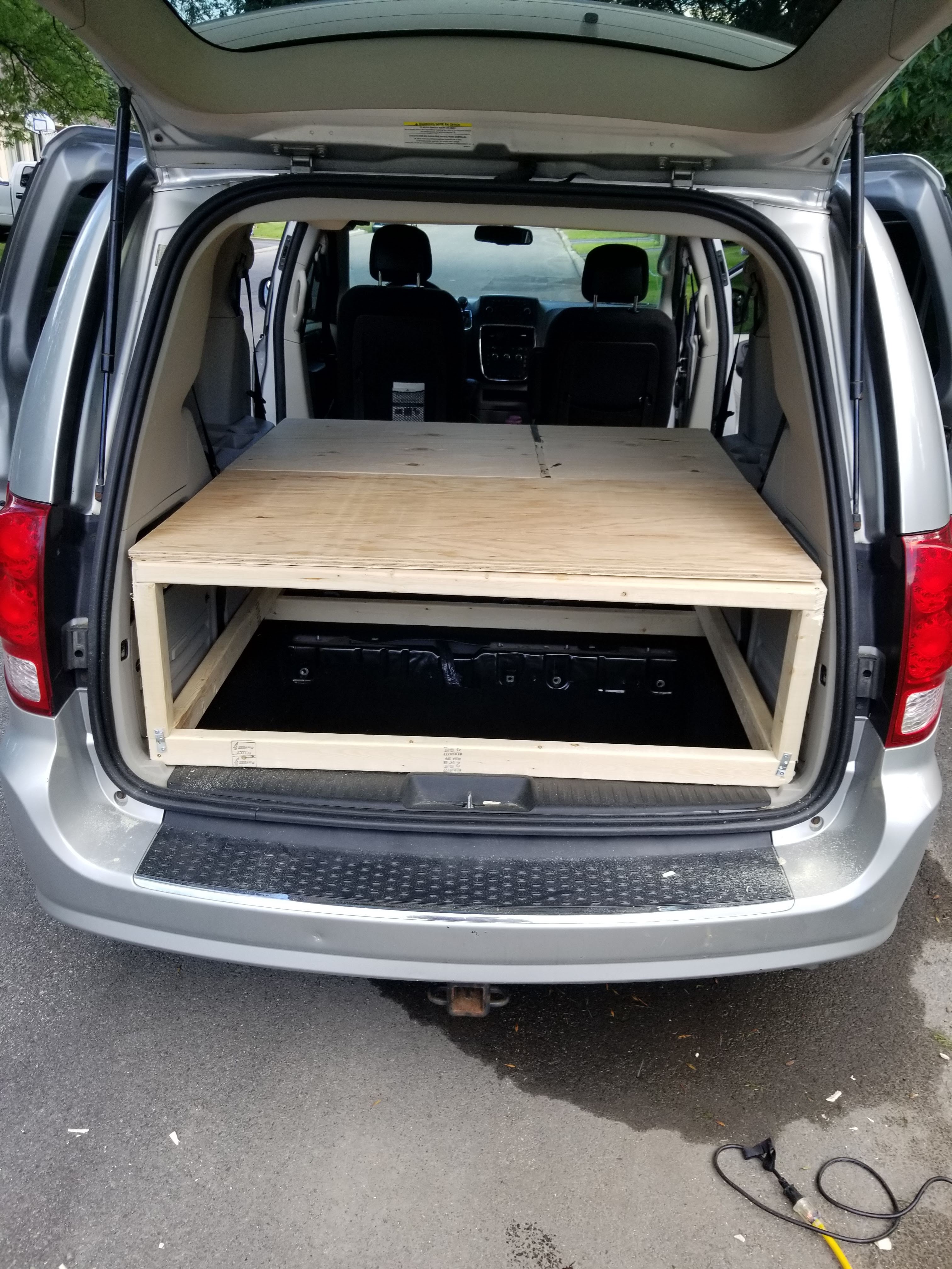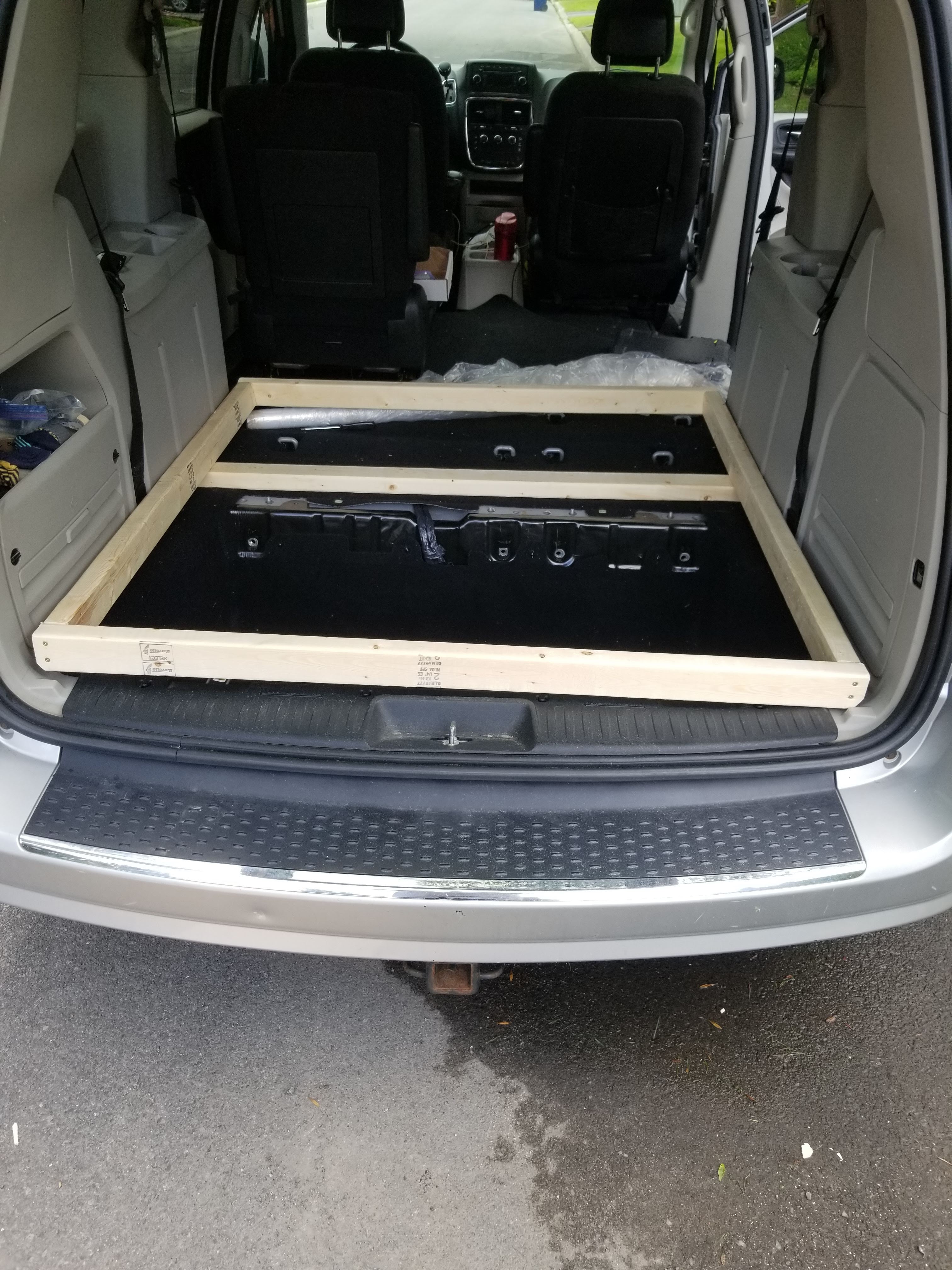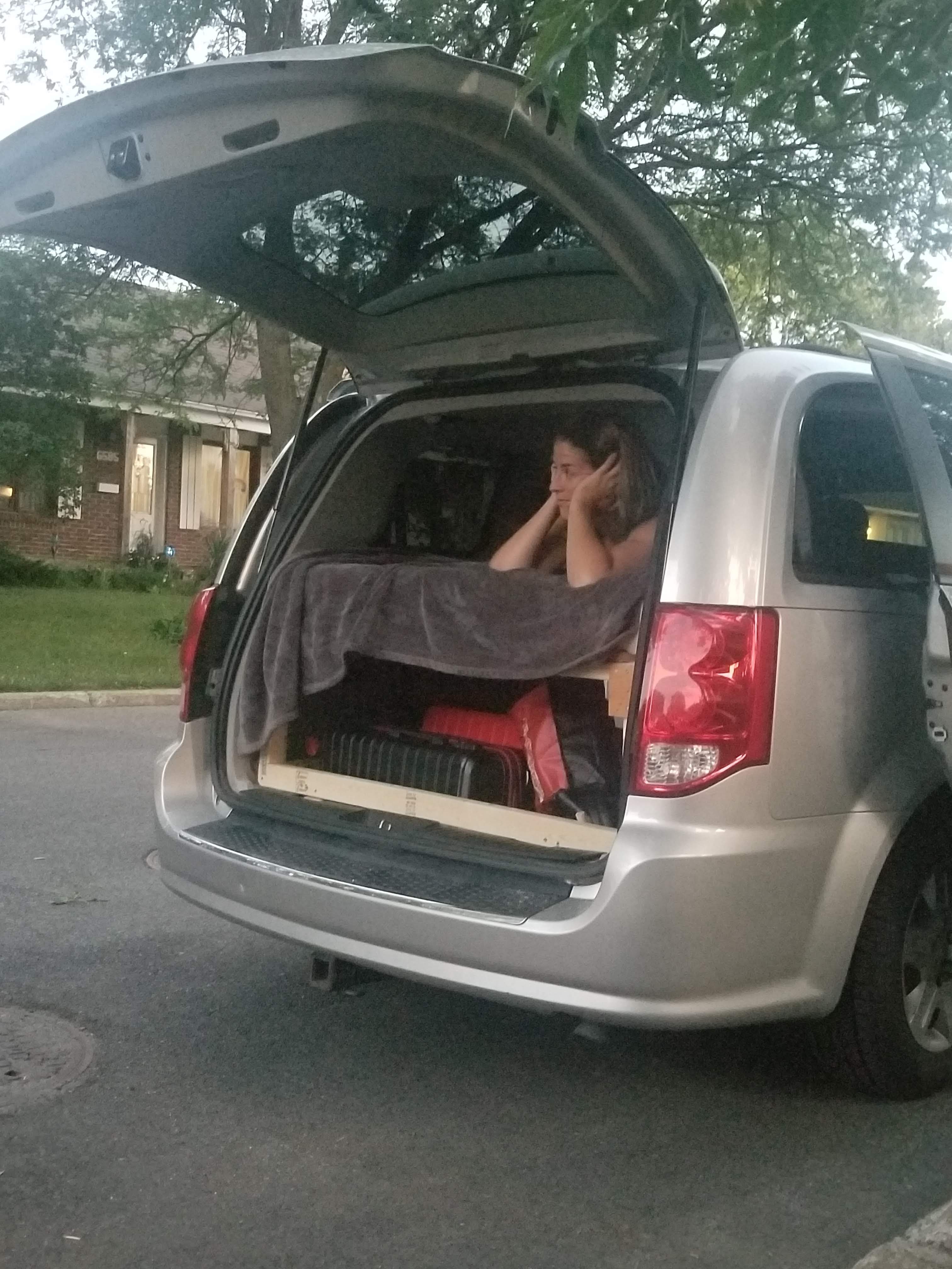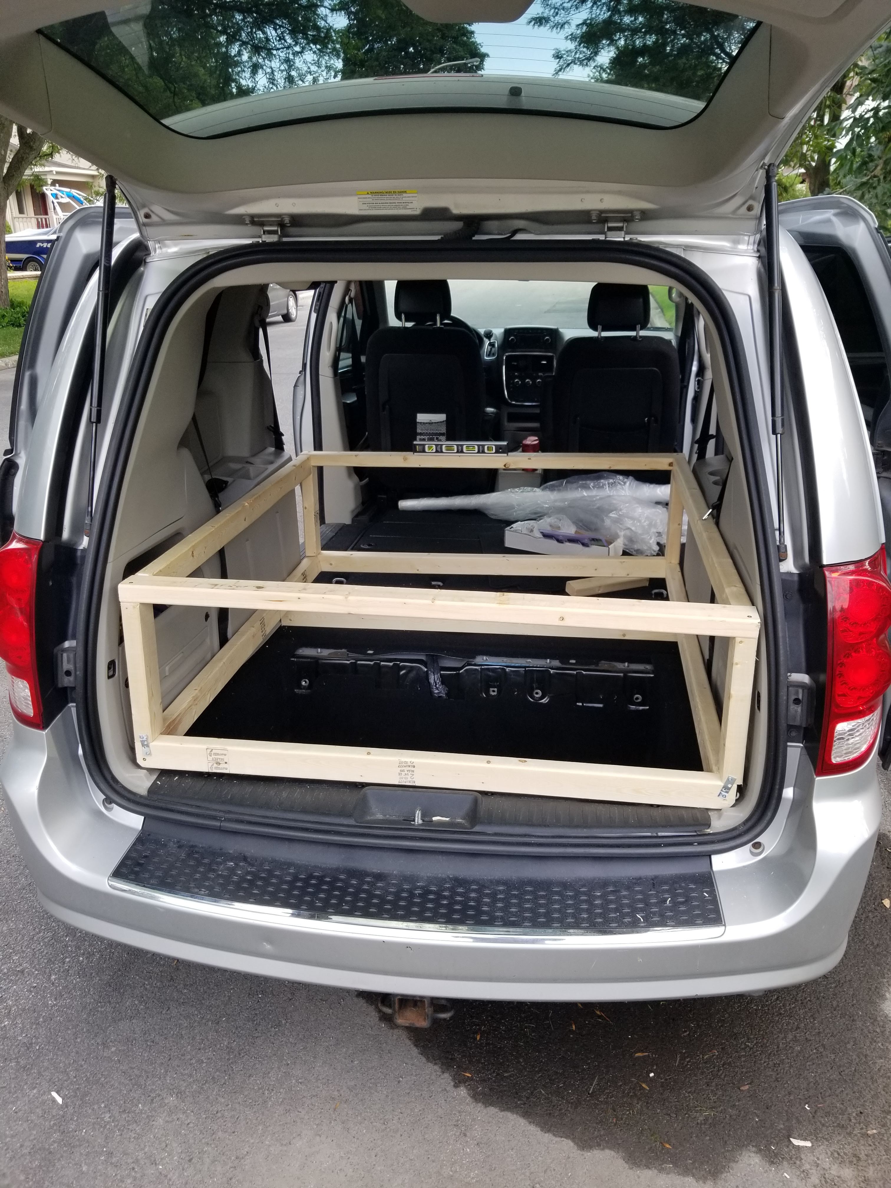 Nous voici donc les heureux proprios d’une Dodge Grand Caravan 2012. Qui aurait cru ? Certainement pas moi ! Quelques semaines plus tard lorsque les travaux du voilier sont devenus un peu moins prioritaires, Simon nous a fabriqué un petit nid douillet dans lequel nous pourrons nous assoupir et nous ravitailler lorsque nécessaire. Le but était vraiment que cela soit le moins cher possible. Il y a beaucoup d’inspiration sur les différents groupe Facebook, les réalisations qu’on y trouve sont vraiment supers ! Mais nous, c’est temporaire. C’est seulement pour traverser le Canada, car rendu à Whistler nous avons loué une chambre et nous habiterons chez notre ami à Vancouver. Une Grand Caravan, c’est pas si « Grand » que cela, donc habiter là-dedans est absolument impossible.