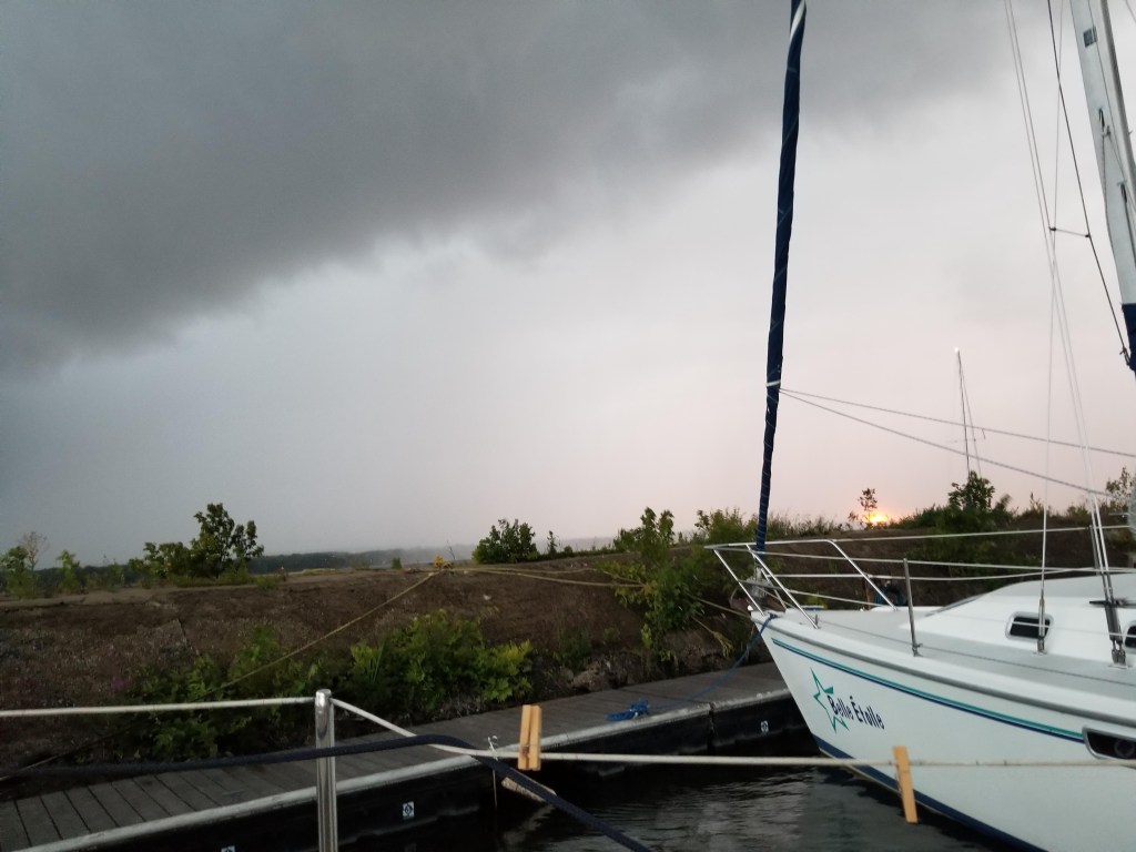 Hier il y a eu une méga averse. Le vent soufflait fort et notre bateau gîtait et se faisait pousser sur le quai. Tout le long de cette pluie soudaine nous étions aux aguets. Ce n’était rien de dangeureux, nous étions en sécurité, mais nous regardions la nature se déchaîner par nos hublots. Nous prenions conscience de ce qui se passait et étudions chaque mouvement et bourasque.