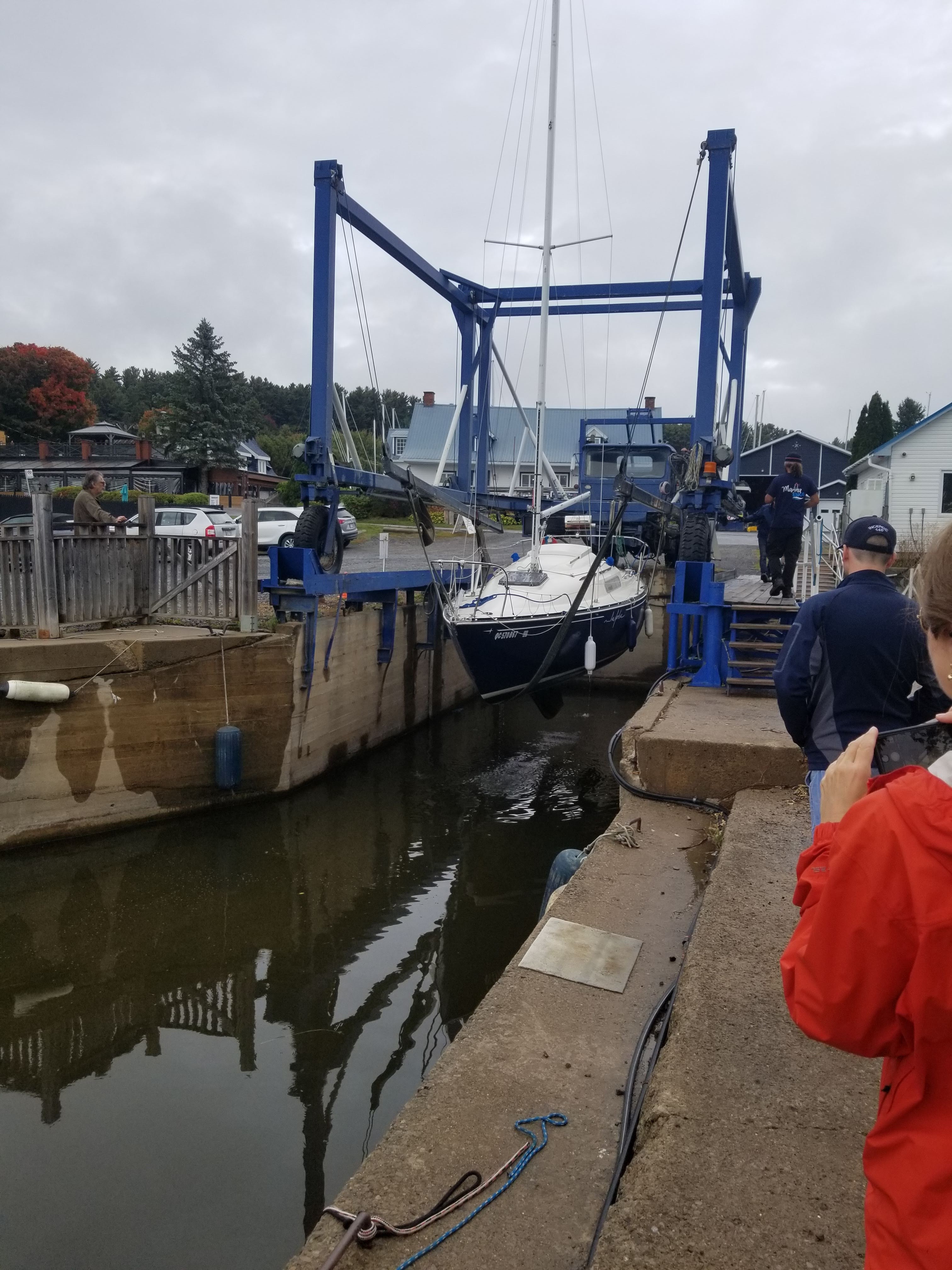 Acheter un voilier en fin de saison, c’est bien excitant, mais cela veut aussi dire : sortie de l’eau imminente. Comme de fait, le lendemain matin le 28 septembre, une journée pluvieuse (mais très chaude) La folie est sortie de l’eau pour se diriger dans la cours, là où elle passera l’hiver.